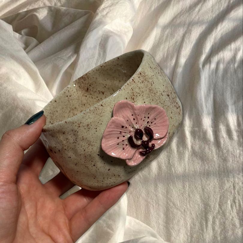 Please note that each mug is individually handmade and hand-painted, so slight variations from the mug shown in the photo are to be expected. The colour shown on the orchid may look different due to the firing temperature.